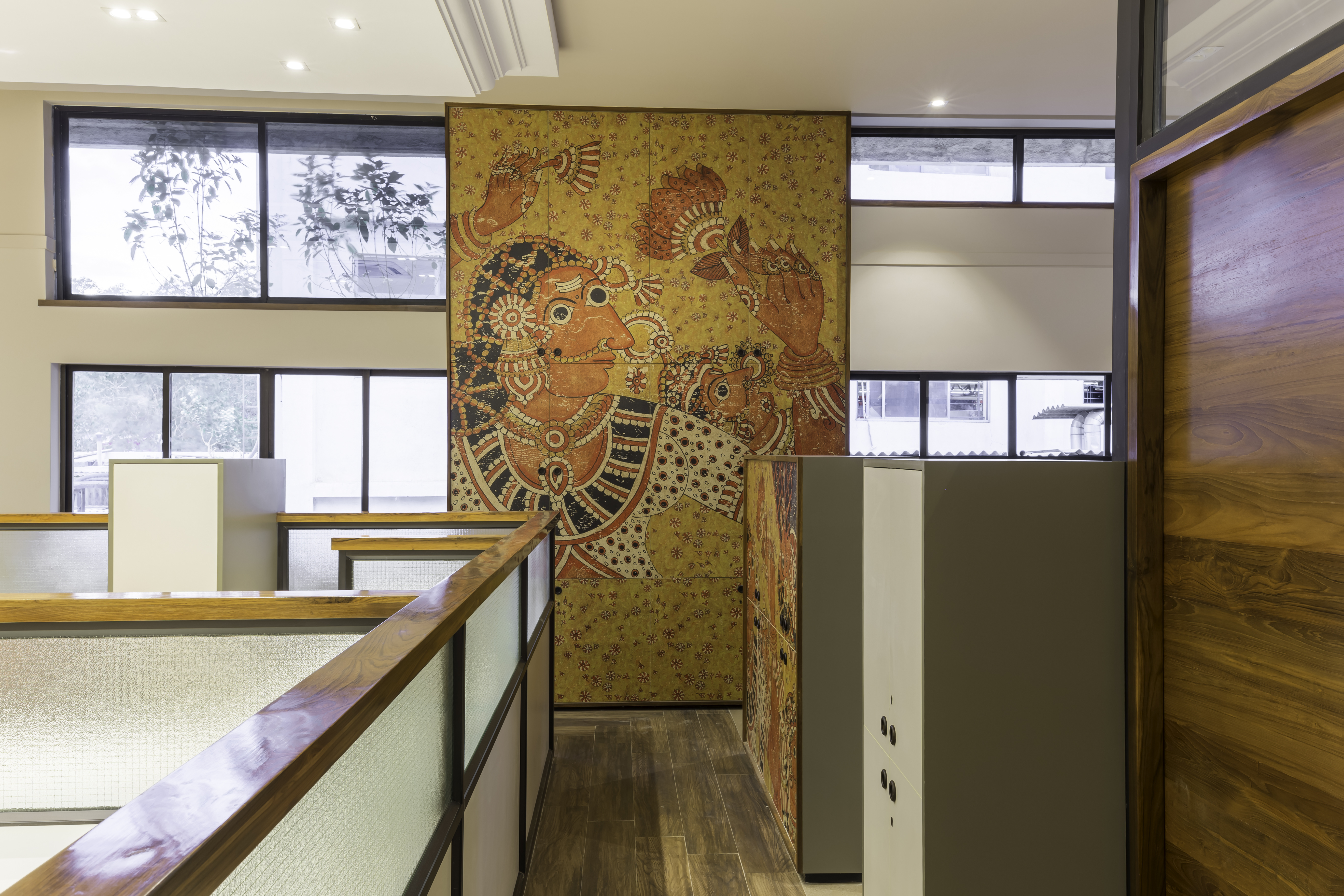 Andhra Leather Puppetry art work enlarged on storage shutters integrates the whole space and brings out a greater warmth for otherwise a mundane office space