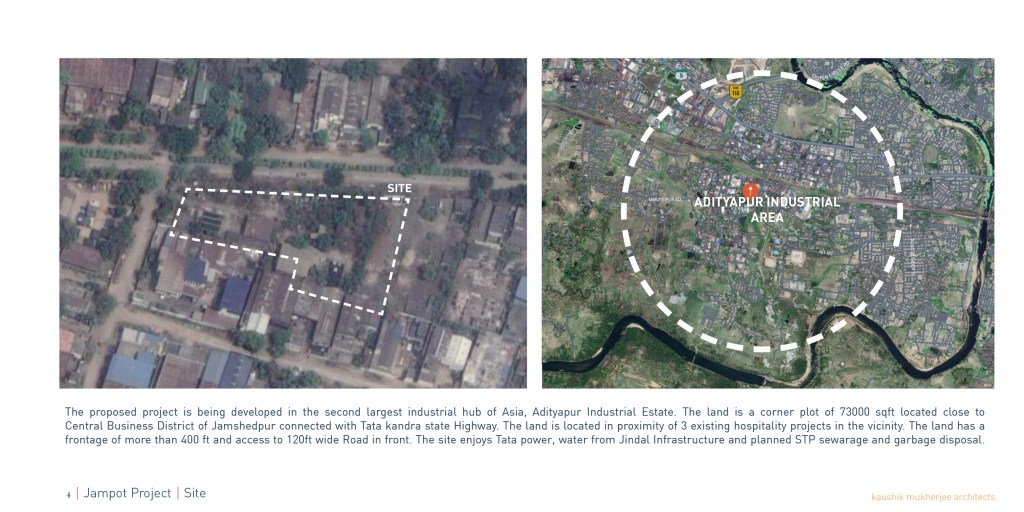 The proposed project is being developed in the second largest industrial hub of Asia, Adityapur Industrial Estate. The land is a corner plot of 73000 sqft located close to Central Business District of Jamshedpur connected with Tata kandra state Highway. The land is located in proximity of 3 existing hospitality projects in the vicinity. The land has a frontage of more than 400 ft and access to 120ft wide Road in front. The site enjoys Tata power, water from Jindal Infrastructure and planned STP sewarage and garbage disposal